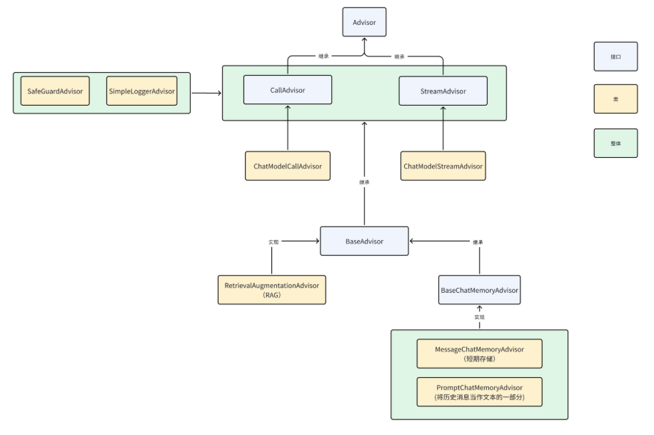 如上Spring AI Alibaba给出了Advisor家族的架构图,其中基础提供了 SafeGuardAdvisor、SimpleLoggerAdvisor、ChatModelCallAdvisor、ChatModelStreamAdvisor、基于 BaseChatMemoryAdvisor 扩展的记忆功能。