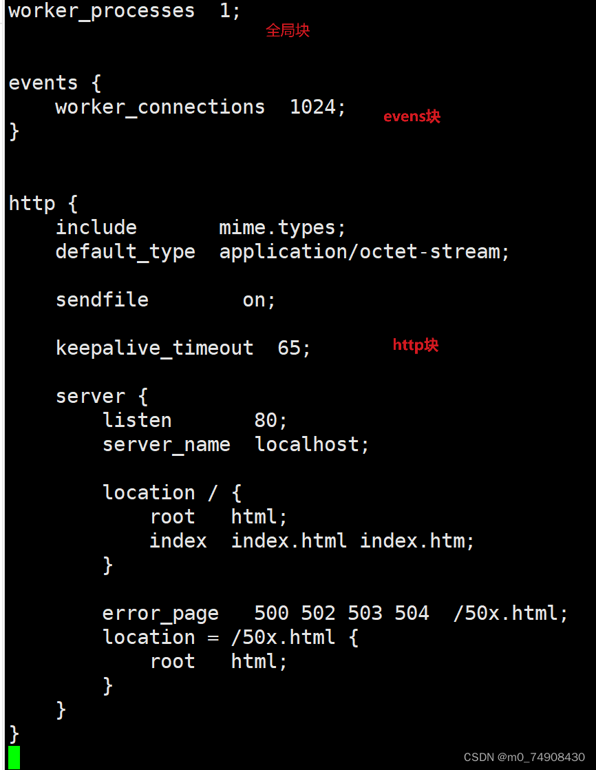 每个 http 块可以包括多个 server 块,而每个 server 块就相当于一个虚拟主机。 而每个 server 块也分为全局 server 块,以及可以同时包含多个 locaton 块。