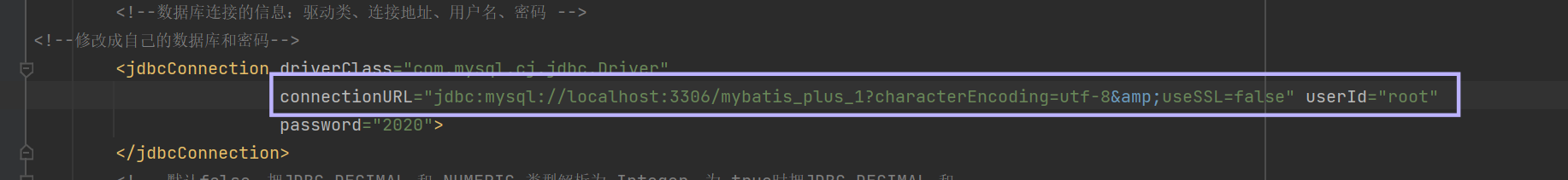 connectionURL="jdbc:mysql://localhost:3306/mybatis_plus_1?characterEncoding=utf-8&useSSL=false" userId="root"