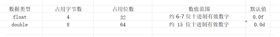 浮点型分为两类点精度浮点数(float)和双精度浮点数 (double)。如下表