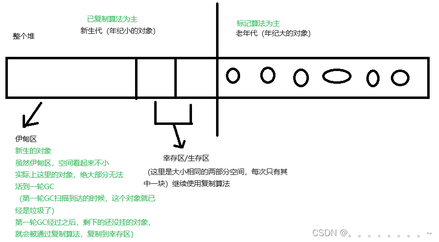 如果一个对象在幸存区,经过了好多轮都还没挂,仍然坚挺,仍然没挂,说明这个对象应该就是“生命周期特别长”的了,这个时候就来到了老年代