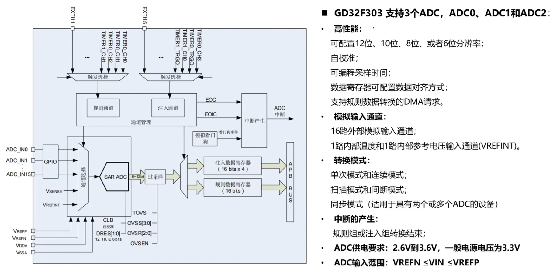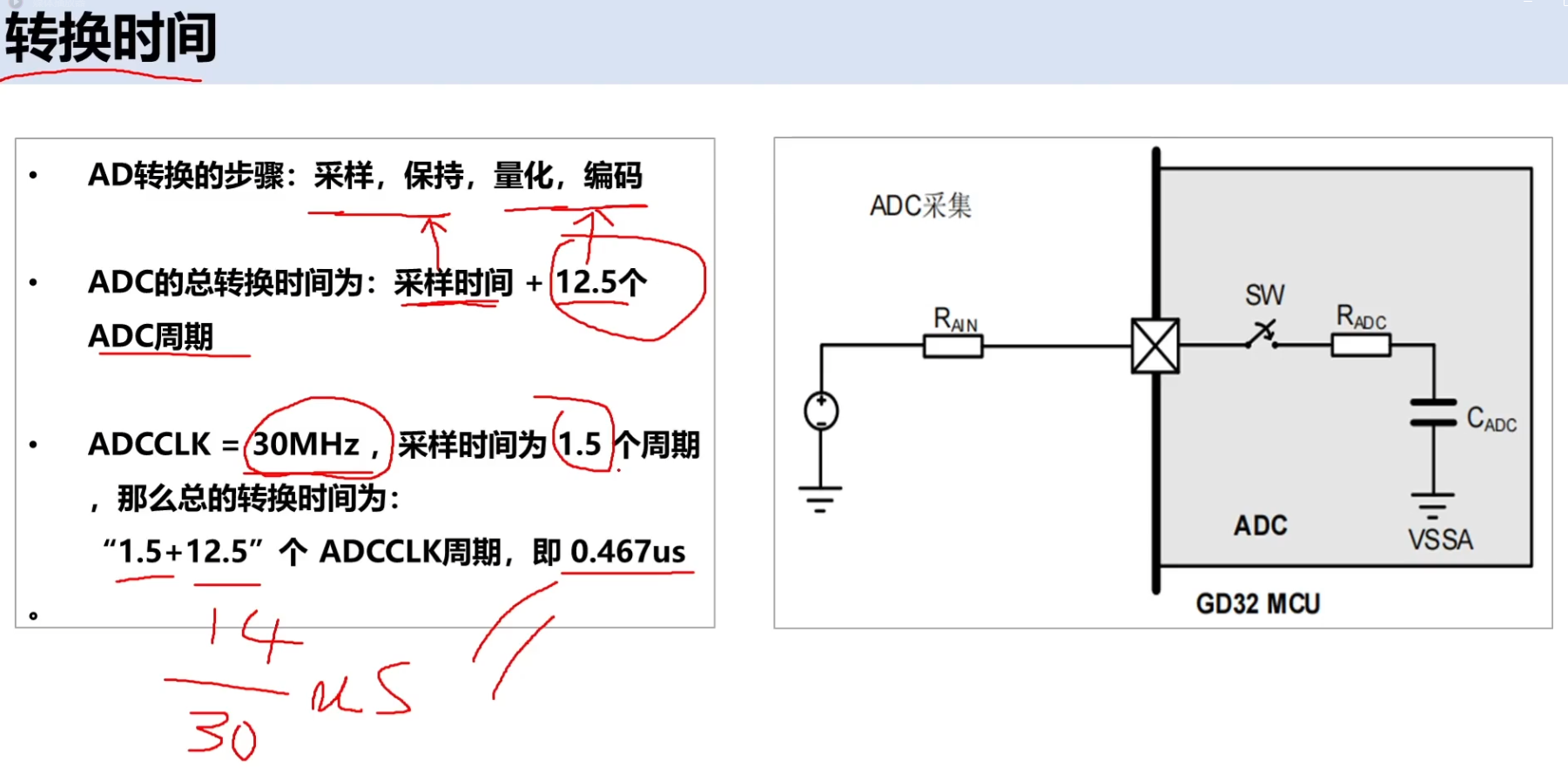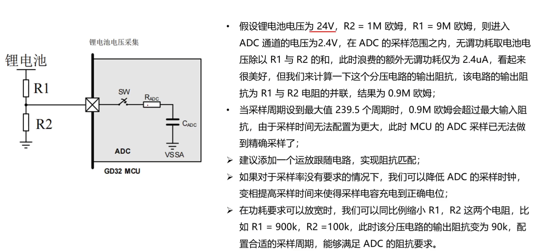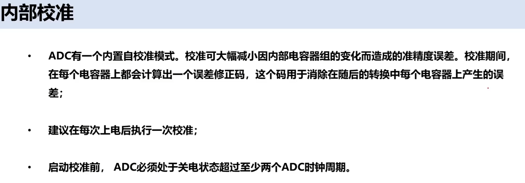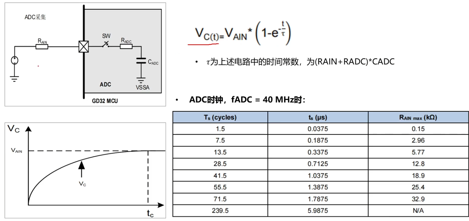 信号源的输出阻抗对ADC的采样有影响表格为不同采样周期Ts(以ADC时钟周期计)对应的时间ts(以微秒计)和最大输入电阻RAIN max(以千欧计),如1.5个ADC采样周期的最大输入电阻为0.15kΩ,大于这个阻值采样的会值不准确