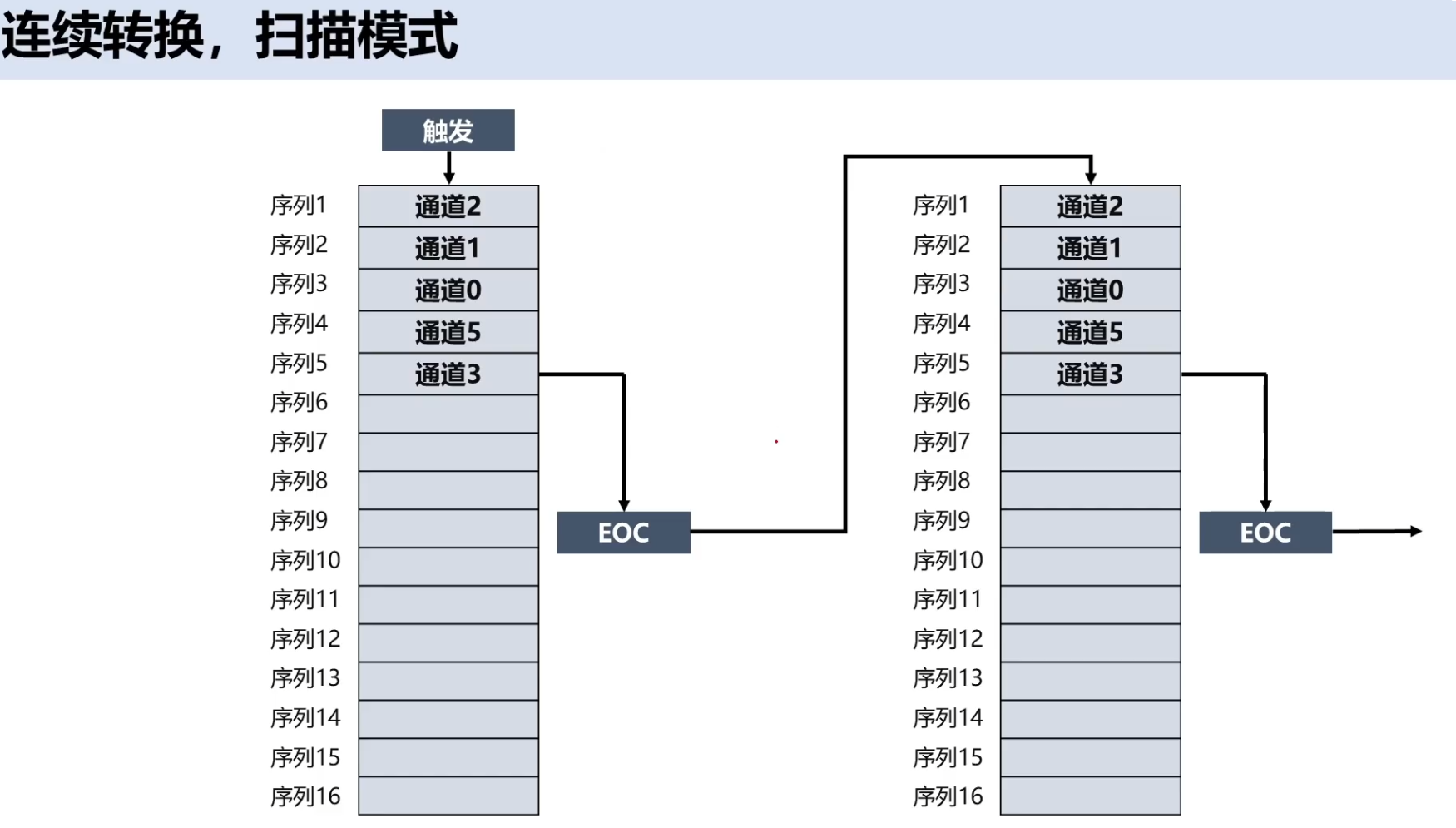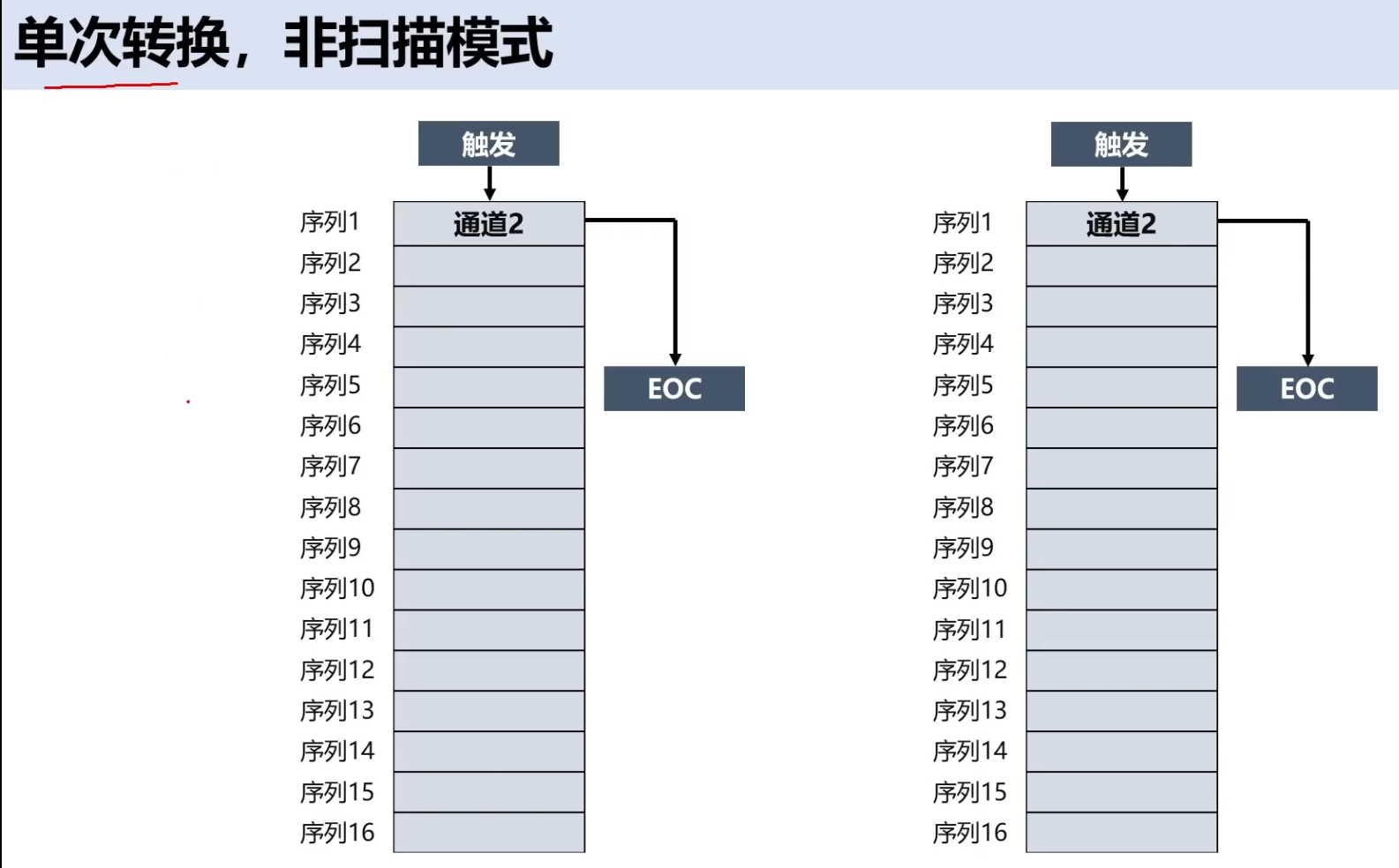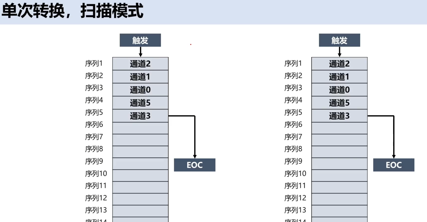 扫描模式要等所有通道转换完成后才会产生eoc标志,每个通道转换完成会把转换值给数据寄存器,但是只有一个数据寄存器,所以我们要用到DMA对数据进行搬运