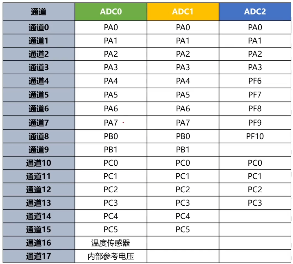adc_regular_channel_config(ADC0, 0, ADC_CHANNEL_12, ADC_SAMPLETIME_239POINT5); // PC2对应通道12,放在序列寄存器的0序列中,239.5个周期
