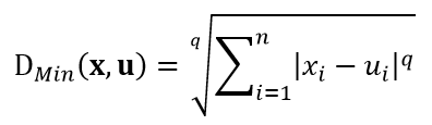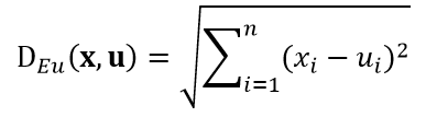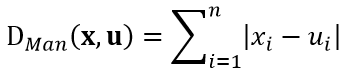 既然样本可以被认为是在度量空间内分布,那么我们就可以用距离测度来衡量它们的相似程度。常用的距离测度包括欧氏距离和曼哈顿距离,以及更一般的明氏距离,以下3个式子分别给出了测试样本u和训练样本x的这三种距离公式: