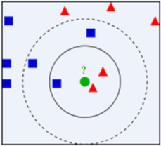 通过一个简单的例子说明一下:如下图,绿色圆要被决定赋予哪个类,是红色三角形还是蓝色四方形?如果K=3,由于红色三角形所占比例为2/3,绿色圆将被赋予红色三角形那个类,如果K=5,由于蓝色四方形比例为3/5,因此绿色圆被赋予蓝色四方形类。