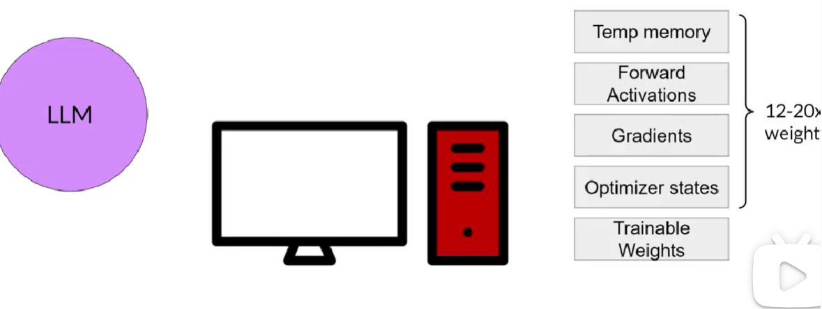 所有模型权重都要被更新的指令微调:全面微调。和预训练一样,全面微调需要足够计算和内存来存储和处理训练期间被更新的所有梯度,优化器和其他组件