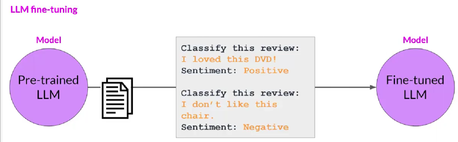 微调:有监督的学习过程,使用标签示例数据集来更新LLM权重,标签示例是一组prompt-compltion对的数据,微调过程延续了模型的训练,提高对特定任务生成好的completion的能力