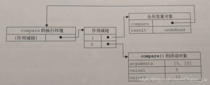 当某个函数被调用时,会创建一个执行环境及其相应的作用域链。然后,使用 arguments 和其他命名参数的值来初始化函数的活动对象。但在作用域链中,外部函数的活动对象始终处于第二位,外部函数的外部函数的活动对象始终处于第三位,……直至作为作用域链终点的全局执行环境。在函数执行的过程中,为了读取和写入变量的值,就需要在作用域链中查找变量。