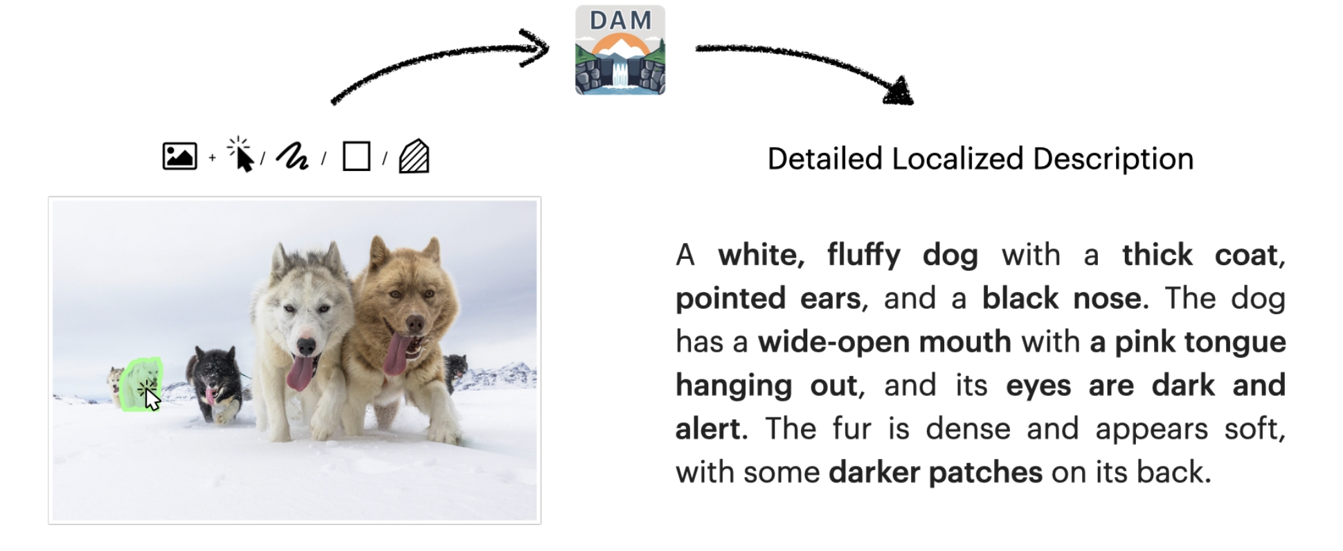 技术亮点:多模态大模型可针对用户指定的区域(点/框/涂鸦)生成详细描述(如“红色项圈银色标签”),通过局部视觉骨干网络和半监督数据管道平衡细节与全局上下文。