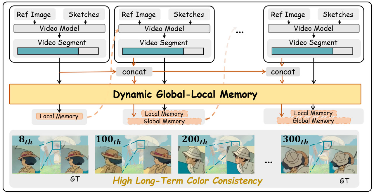 技术亮点:结合SketchDiT和动态全局-局部记忆(DGLM),实现500帧长动画的颜色一致性(优于局部融合方法),支持文本引导背景生成。