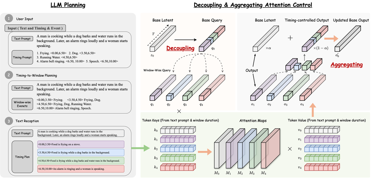 技术亮点:全球首个训练-free的时序控制音频生成框架,通过LLM分解复杂时间提示(如“猫叫0s-24s”)为时间窗口,结合解耦注意力控制和上下文潜在组合,实现高精度音画同步。