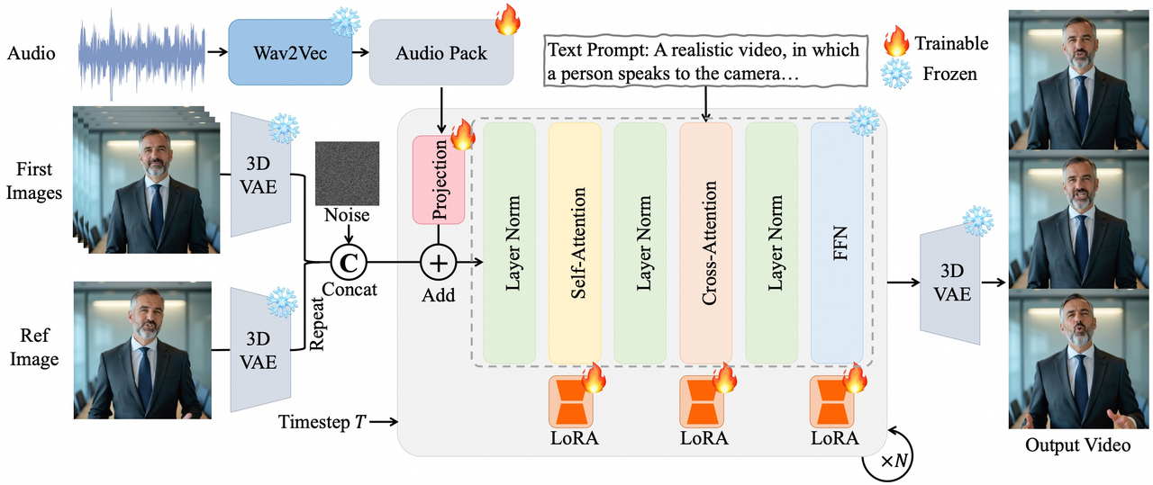 技术亮点:像素级多层级音频嵌入提升口型同步精度,LoRA训练兼容基础模型,支持情感、背景、动作幅度控制。