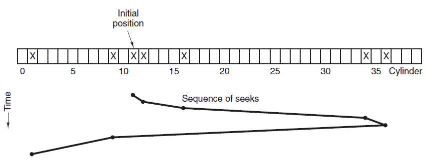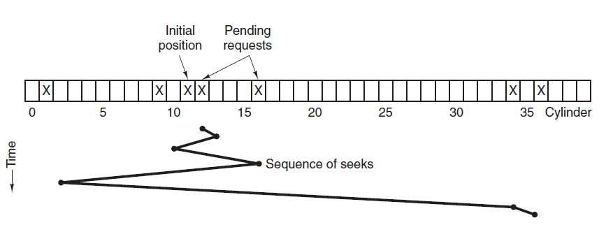 虽然平均寻道时间比较低,但是不够公平。如果新到达的磁道请求总是比一个在等待的磁道请求近,那么在等待的磁道请求会一直等待下去,也就是出现饥饿现象。具体来说,两端的磁道请求更容易出现饥饿现象。