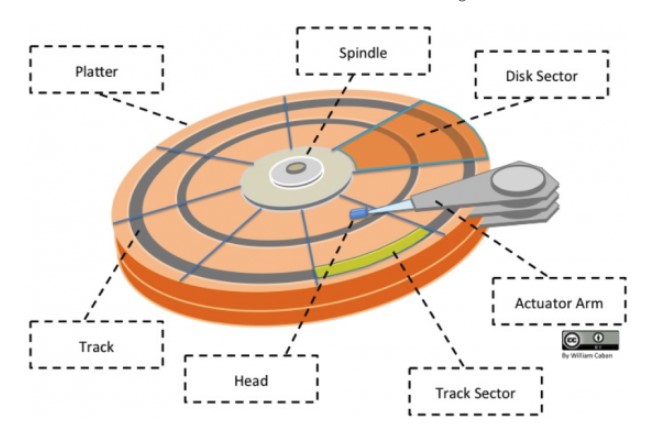 - 磁头(Head):与盘面非常接近,能够将盘面上的磁场转换为电信号(读),或者将电信号转换为盘面的磁场(写);