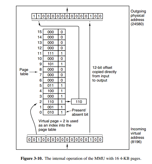 下图的页表存放着 16 个页,这 16 个页需要用 4 个比特位来进行索引定位。例如对于虚拟地址(0010 000000000100),前 4 位是存储页面号 2,读取表项内容为(110 1),页表项最后一位表示是否存在于内存中,1 表示存在。后 12 位存储偏移量。这个页对应的页框的地址为 (110 000000000100)。
