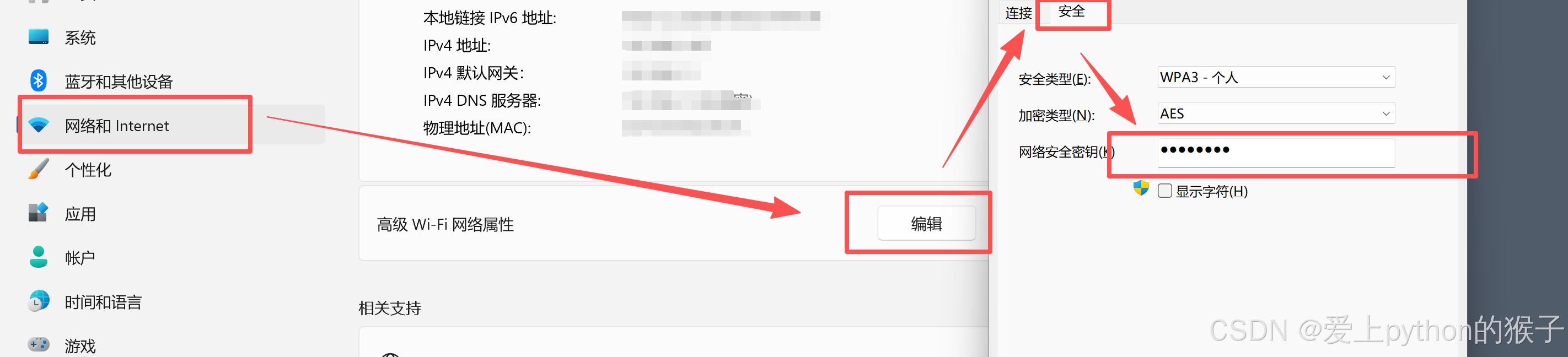 右键任务栏WiFi图标→“网络和Internet设置”→“网络和共享中心”→点击WiFi名→“无线属性”→“安全”→勾选“显示字符