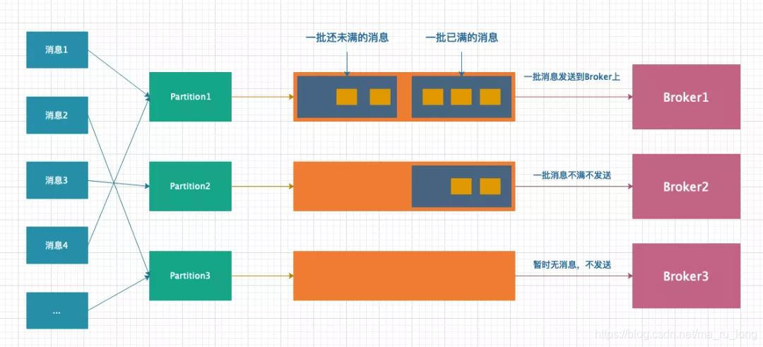 一条消息首先需要确定要被存储到那个 partition 对应的双端队列上;其次,存储消息的双端队列是以批的维度存储的,即 N 条消息组成一批,一批消息最多存储 N 条,超过后则新建一个组来存储新消息;其次,新来的消息总是从左侧写入,即越靠左侧的消息产生的时间越晚;最后,只有当一批消息凑够 N 条后才会发送给 Broker,否则不会发送到 Broker 上