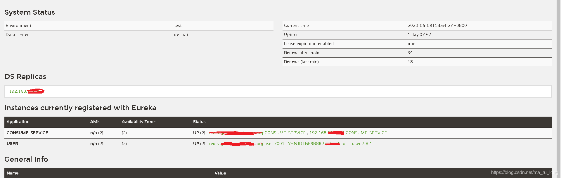 搭建了springcloud服务如上图;eureka 集群两台、CONSUME-SERVICE 有两台 、USER有两台