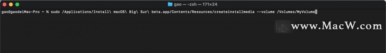 sudo /Applications/Install\ macOS\ Big\ Sur.app/Contents/Resources/createinstallmedia --volume /Volumes/MyVolume