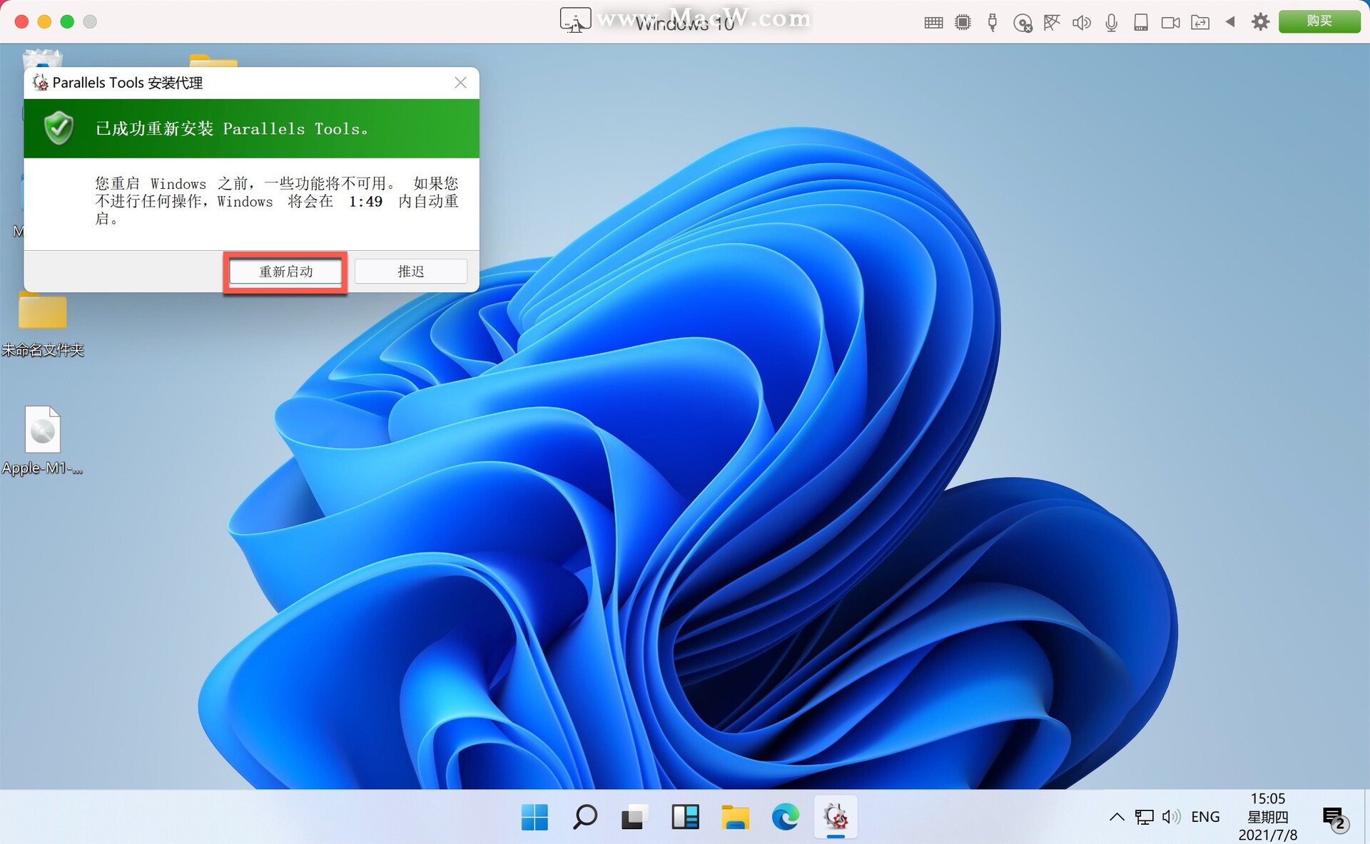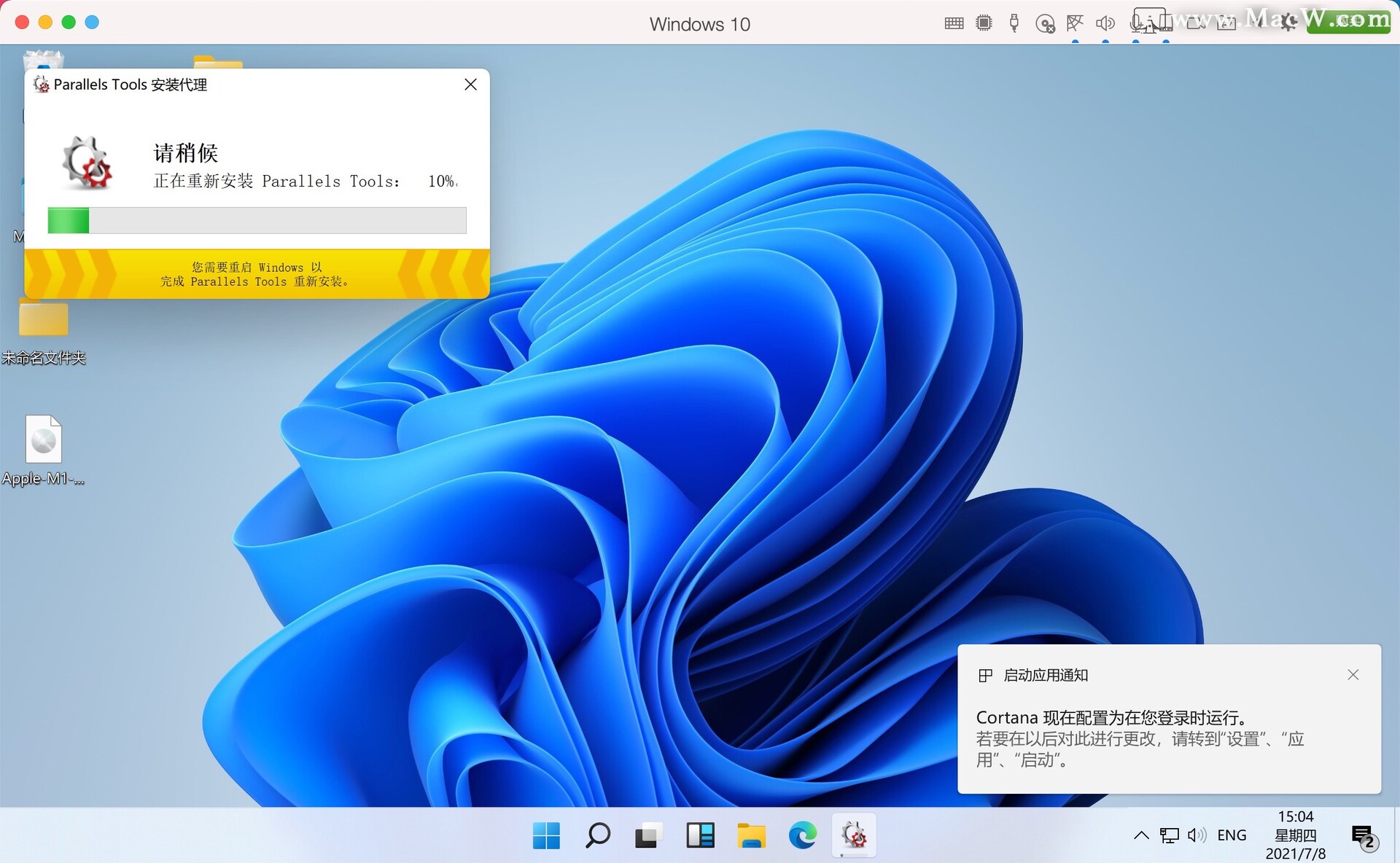 经历几次重启后,进入Win11系统,电脑会自动更新Parallels Tools,等待一分钟即可