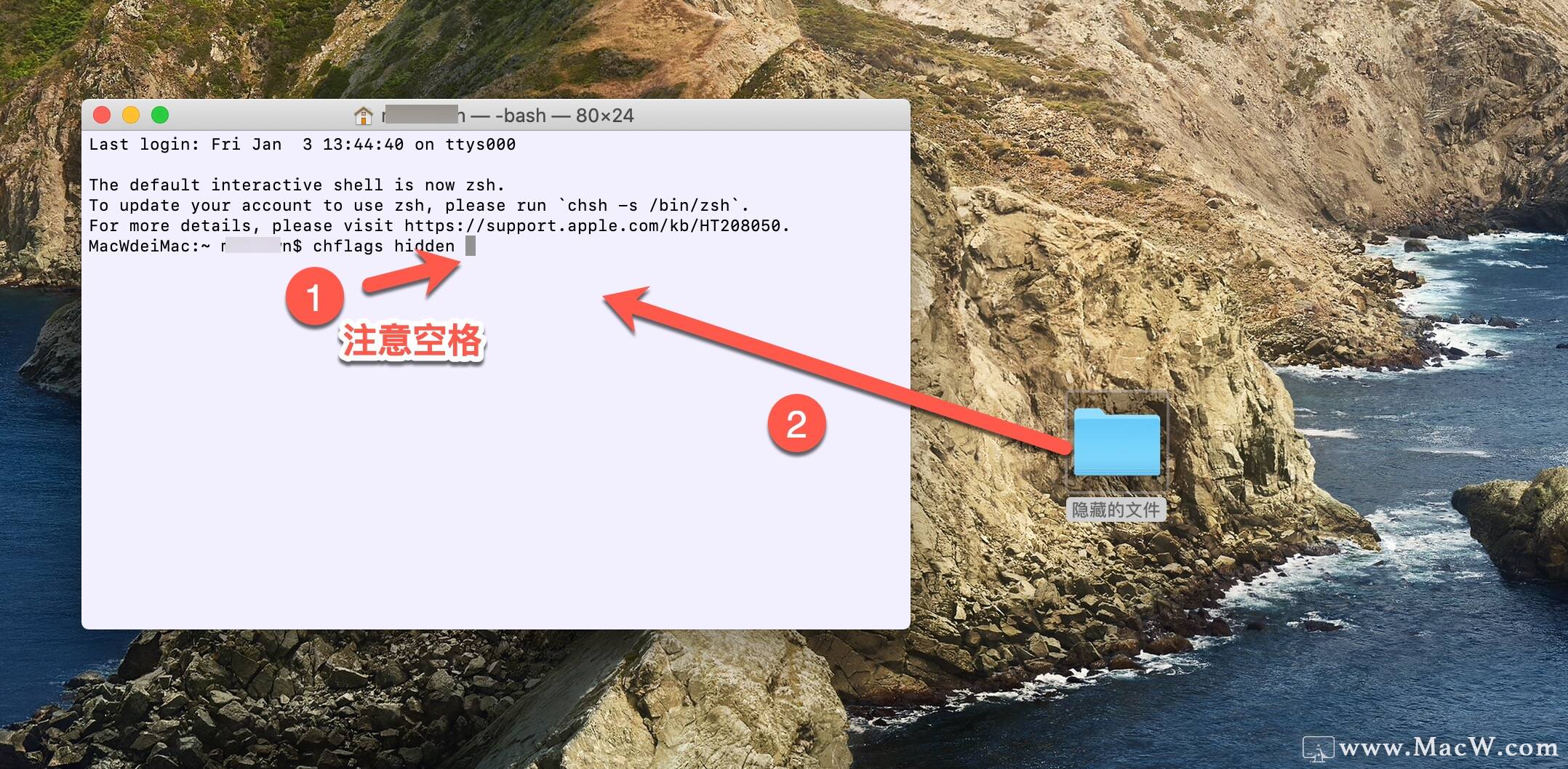 打开终端(Terminal),在终端中输入 mkdir 文件位置/.文件名称,如mkdir desktop/.MacW,按回车键(return)执行命令,即可创建一个隐藏文件夹(.MacW)。