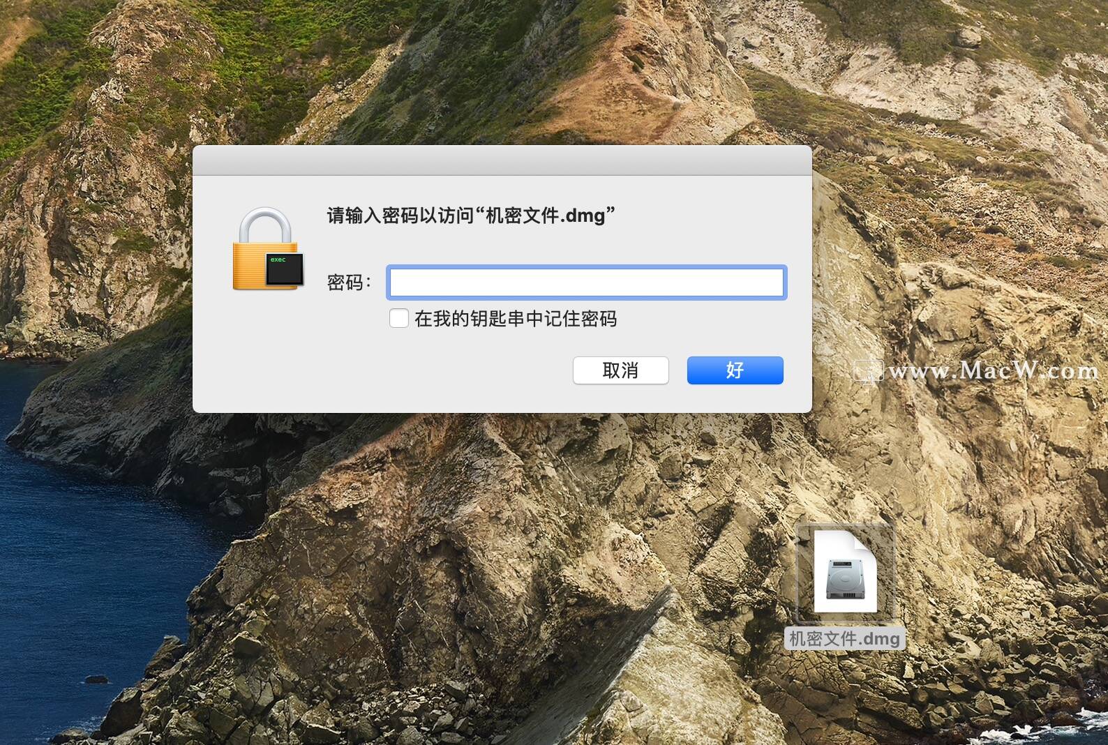 当你想访问这个加密磁盘时就要输入密码了,不过在输入密码前一定要 取消选中 "在我的钥匙串中记住密码",否则密码就白设了。