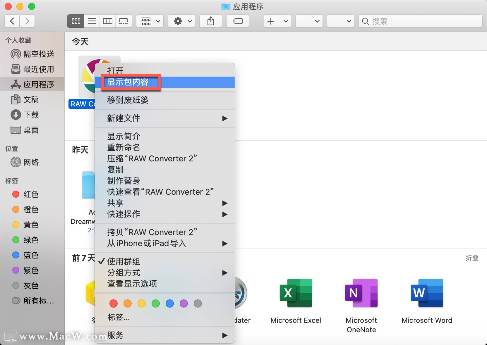 Mac应用程序都是一些 .app 的文件夹,在应用程序的图标上右键会有一个显示包内容的选项,在这个包里面装的都是程序文件和资源文件,一般人是不会访问这里的。