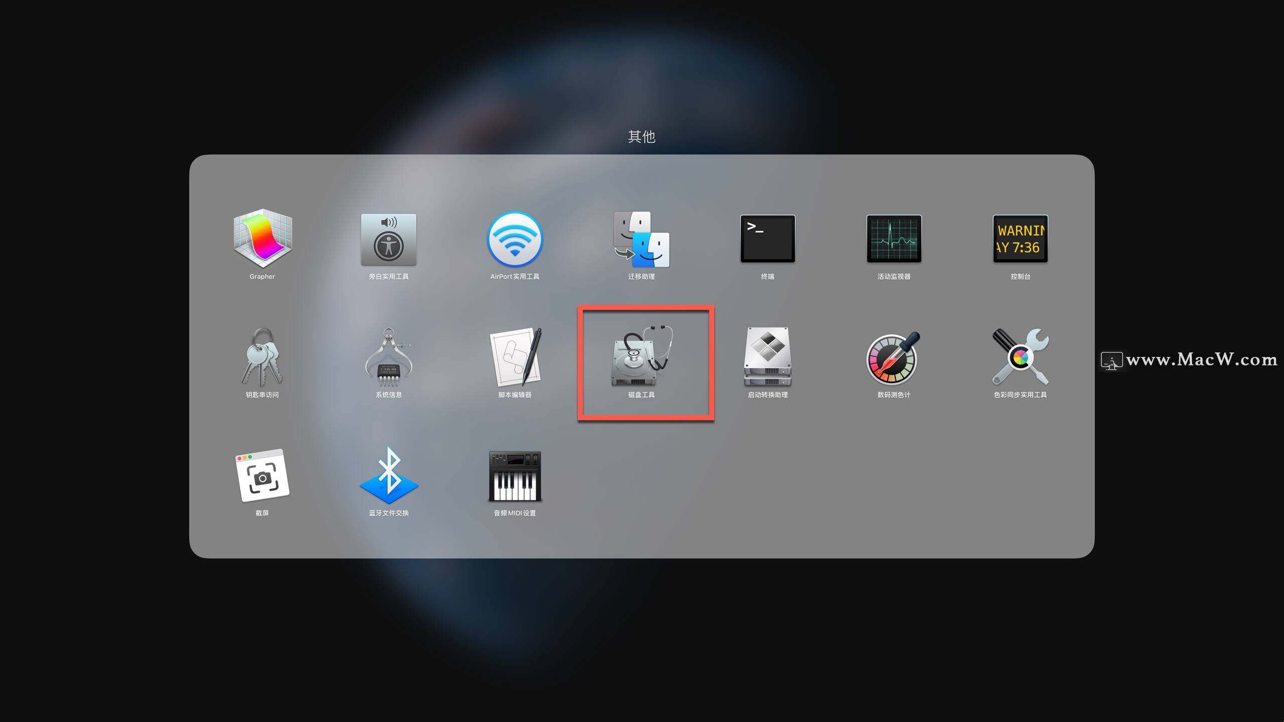 进入 Launchpad【启动台】 的其他文件夹中,打开磁盘工具。
