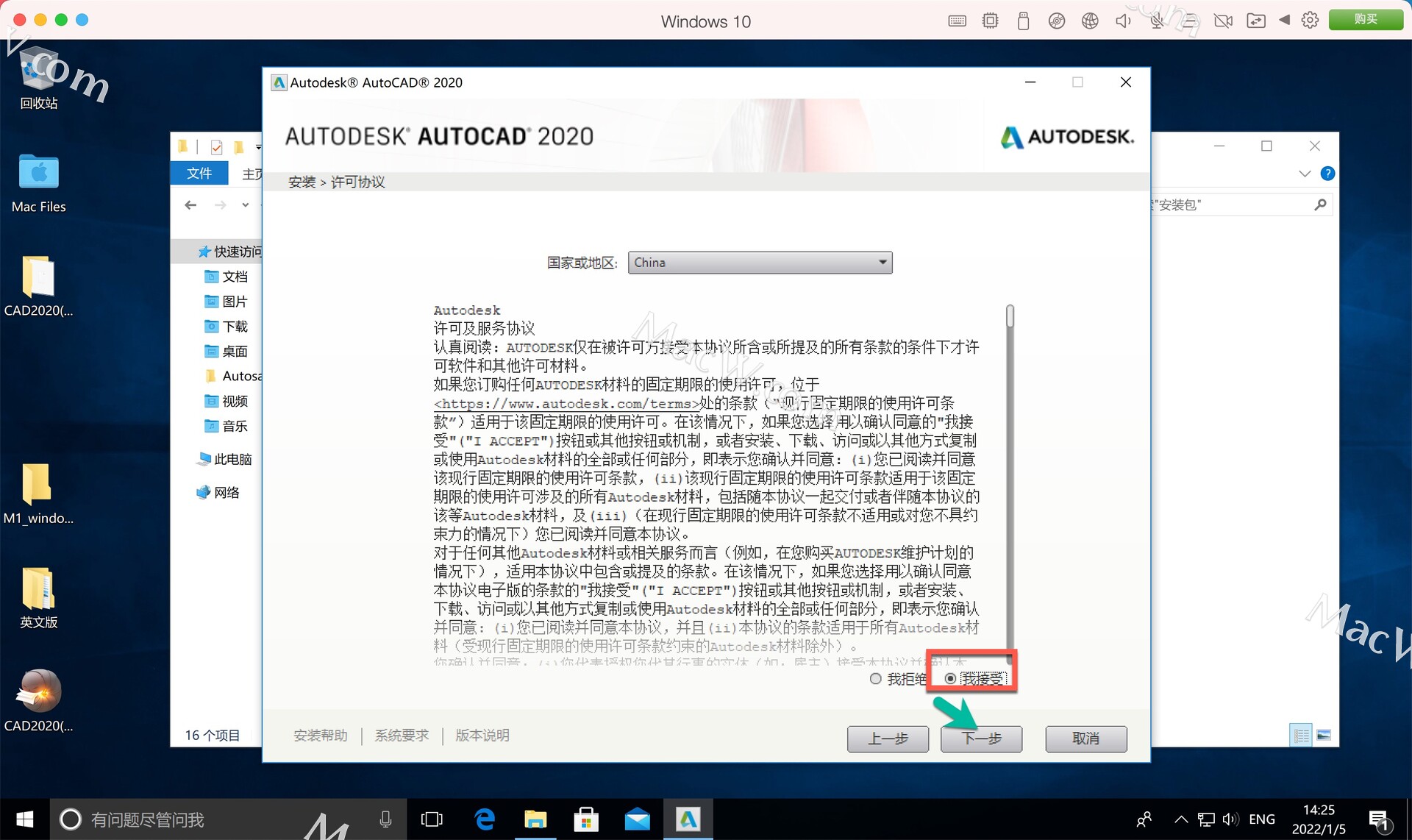 5.选择【我接受】,点击【下一步】。