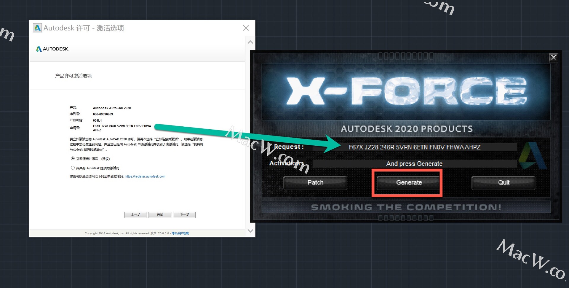 18.生成激活码:①使用快捷键“Ctrl+C”复制【申请号】后的代码;②使用快捷键“Ctrl+V”将代码粘贴到【Request】后的框中;③点击【Generate】生成激活码。