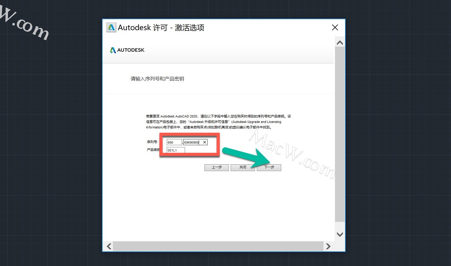 12.输入序列号【666-69696969】,输入产品密钥【001L1】,点击【下一步】。