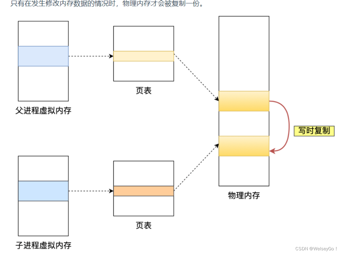 (kernel会把主进程中的所有内存页的权限都设为read-only,主进程和子进程访问数据的指针都指向同一内存地址。主进程发生写操作时,因为权限已经设置为read-only了,所以会触发页异常中断(page-fault)。在中断处理中,需要被写入的 内存页面会复制一份,旧数据交给子进程使用,然后主进程该干啥就干啥。)
