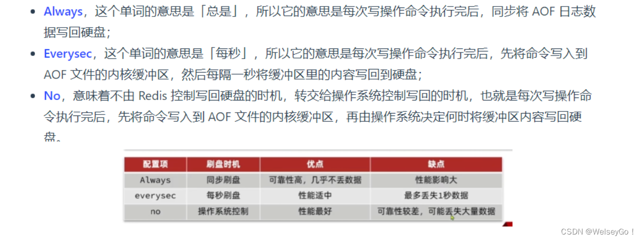 1:执行写操作命令和记录日志是两个过程,那当 Redis 在还没来得及将命令写入到硬盘时,服务器发生宕机了,这个数据就会有丢失的风险。