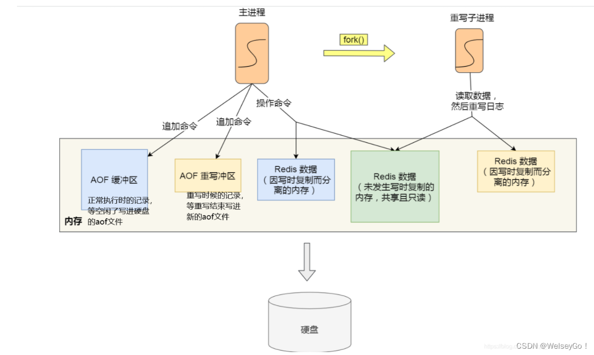 在重写 AOF 期间,当 Redis 执行完一个写命令之后,它会同时将这个写命令写入到 「AOF 缓冲区」和 「AOF 重写缓冲区」。