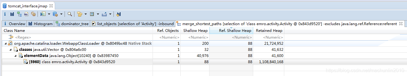 Merge Shortest Path To GC Roots:快速分析的一个常用功能,它能够从当前内存映像中找到一条指定对象所在的到GC Root的最短路径。