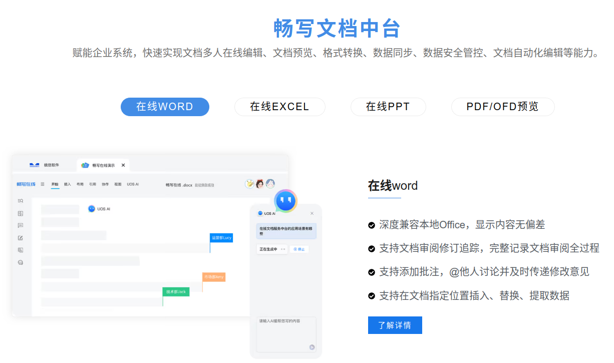 在线文档中台实现 Word 编辑插件的国产化替换,无论是从政策合规、信息安全,还是技术自主发展的角度来看,都具有重要的现实意义。而畅写文档中台或金山文档中台等国产化解决方案,凭借各自的优势,能够满足不同行业、不同场景下的办公需求,为推动我国办公软件国产化进程提供了有力的支持。企业和机构应根据自身实际情况,积极选择合适的国产化方案,助力我国信创产业的发展。