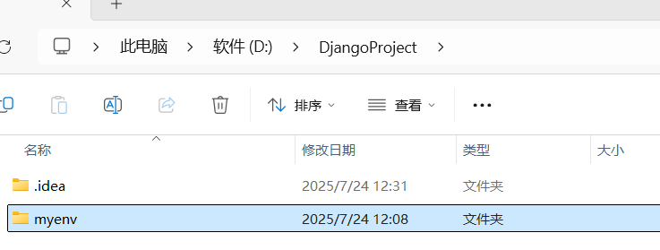 验证是否创建成功:项目文件夹下有“虚拟环境名称”的文件夹。