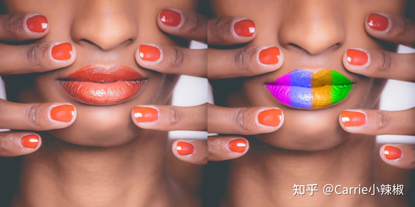 - 使用快速选择工具将嘴唇抠出,可使用 选择—修改—收缩或扩展 来调整选区,然后针对彩色组添加蒙版,按住 Option 点击蒙版,使色彩仅针对嘴唇上色