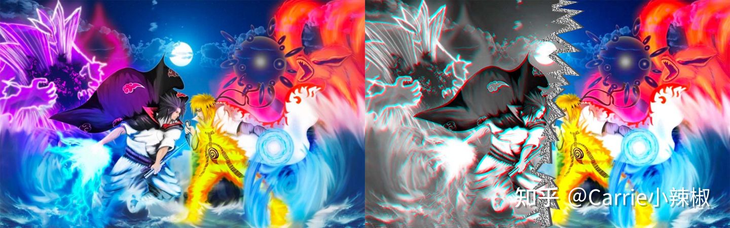 - 创建新的调整调整图层1—色相/饱和度—将色彩饱和度调高,并按住 Option 点击创建剪贴蒙版,仅对黑色图层生效;创建新的调整调整图层2—曲线—微调输入值