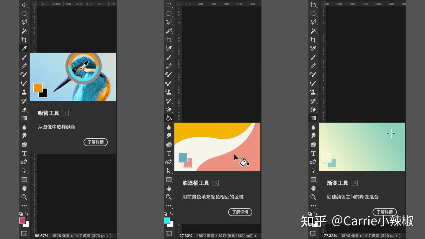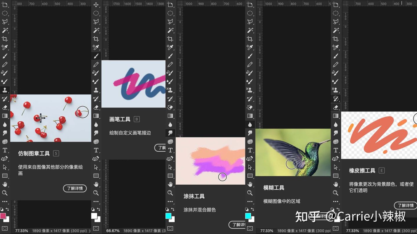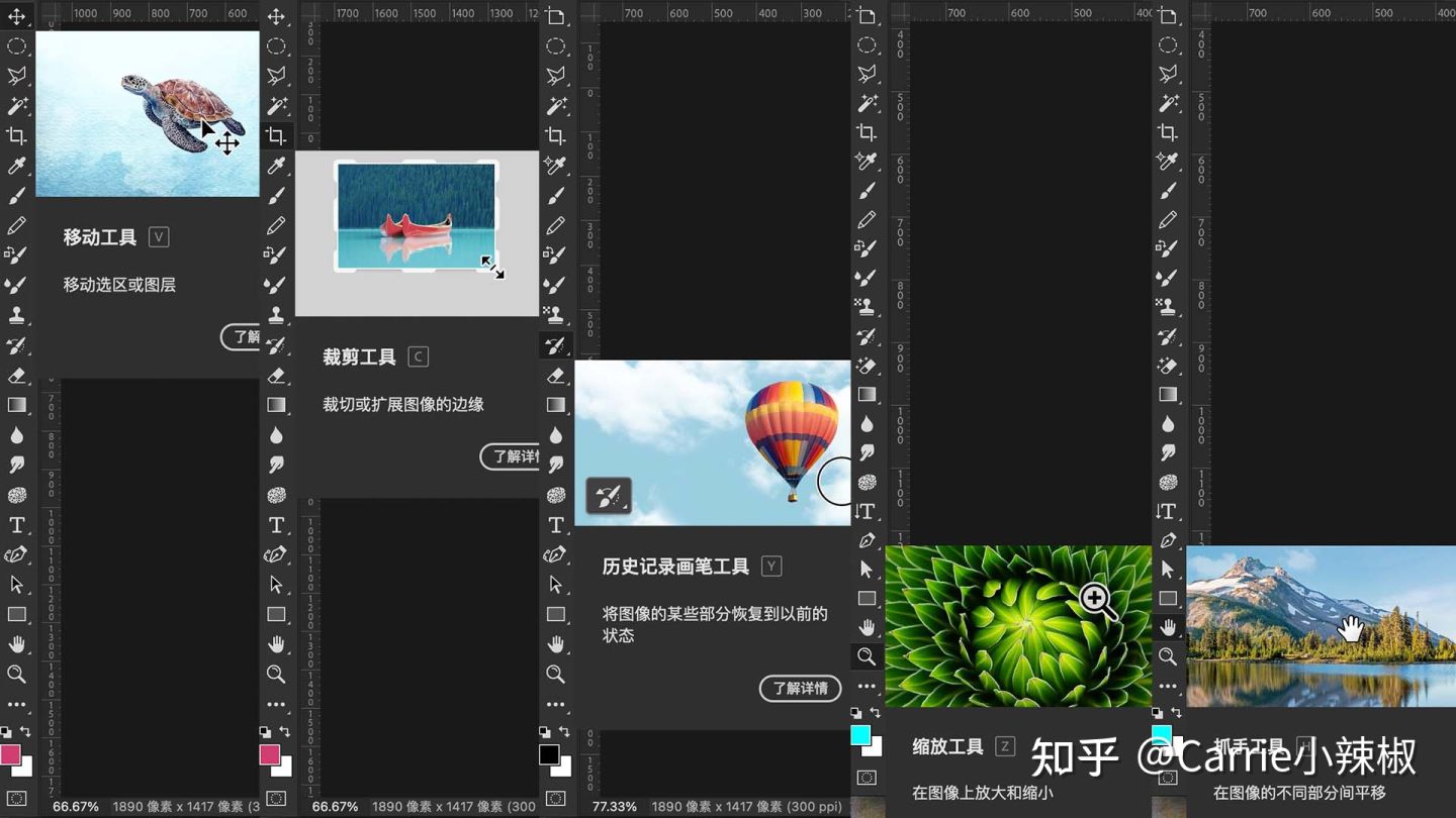 缩放工具:可放大或缩小图像局部区域,command 与+ /— 号使用可快捷实现该功能