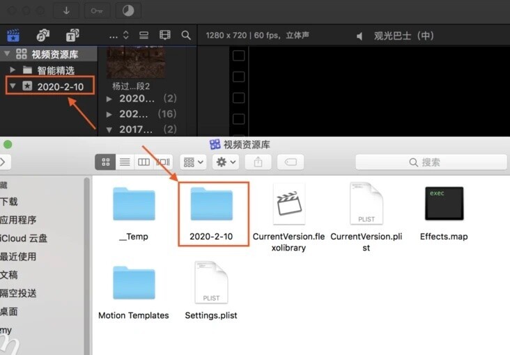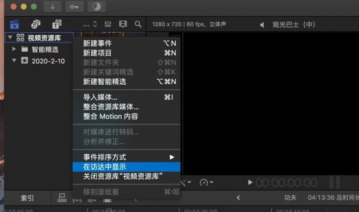 打开FCPX,选择资源库,右键在访达中显示,如图: