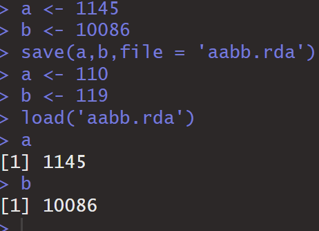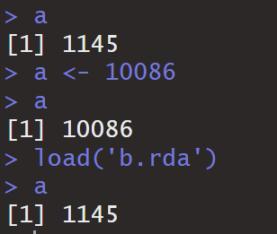 而.Rdata(.rda)文件可以存储多个变量,且能存储相应变量名,导入后会覆盖其他同名变量,效果如下图: