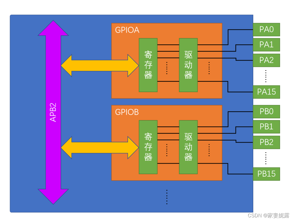 GPIO:通用的输入输出口,它被分为分为7个端口,分别是GPIOA、GPIOB、GPIOC、GPIOD、GPIOE、GPIOF、GPIOG,每个端口拥有16个引脚,分别是Px0~Px15,其中x代表不同的端口号(如端口A,它的16个引脚就是PA0~PA15)。