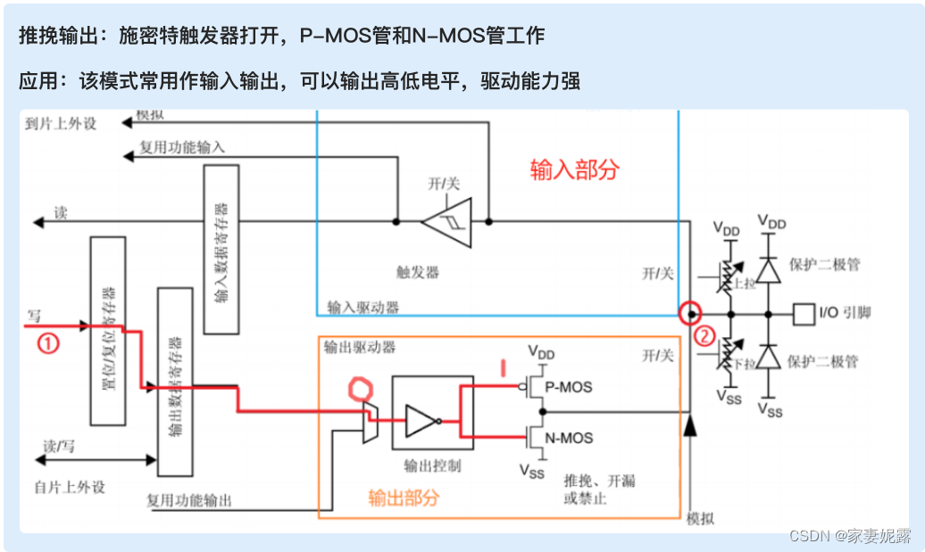 | 推挽输出 | 输出 | 引脚即可以输出低电平、还可以输出⾼电平 |