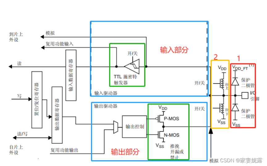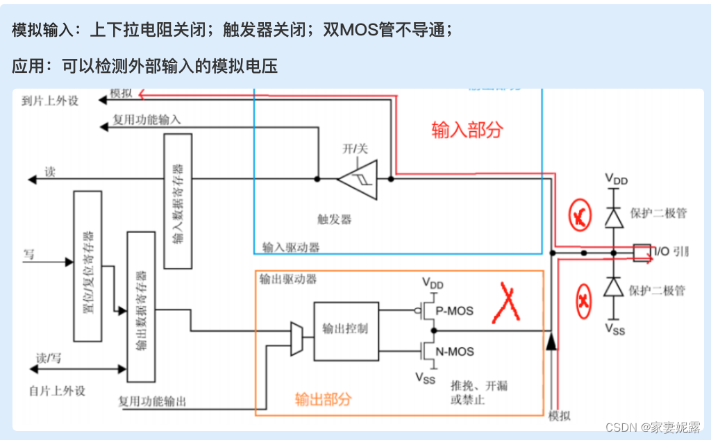| 模拟输⼊ | 输入 | GPIO⽆效,引脚直接接⼊其他外设 |