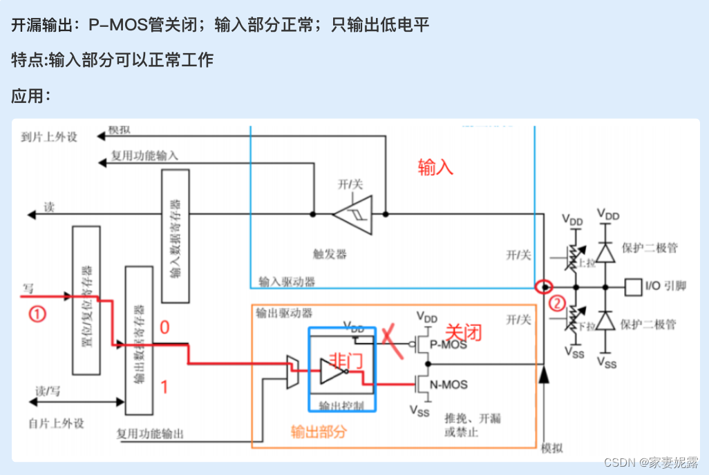 | 开漏输出 | 输出 | 引脚只输出低电平 |