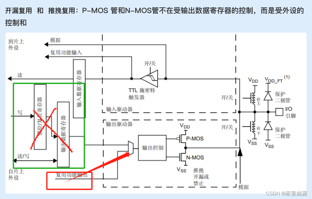 | 复⽤开漏输出 | 输出 | 由⽚上外设控制,只输出低电平 |