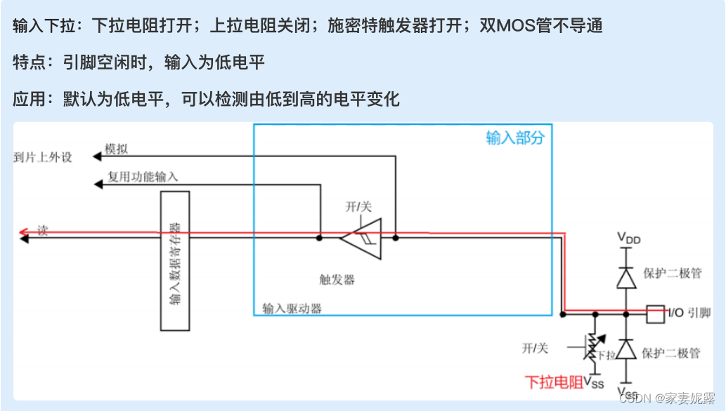 | 下拉输入 | 输入 | 可读取引脚电平,内部连接下拉电阻,悬空时默认低电平 |