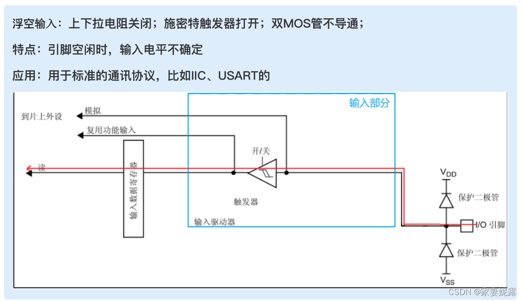 | 浮空输入 | 输入 | 可读取引脚电平,若引脚悬空,则电平不确定 |